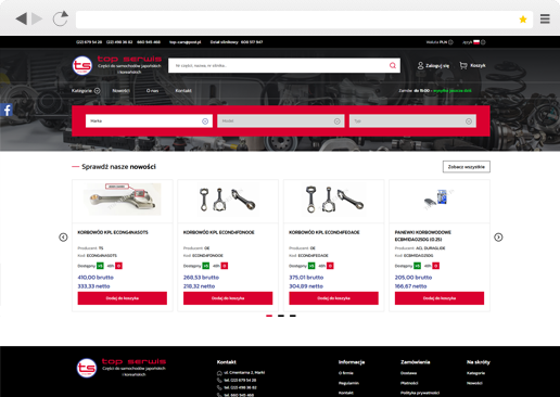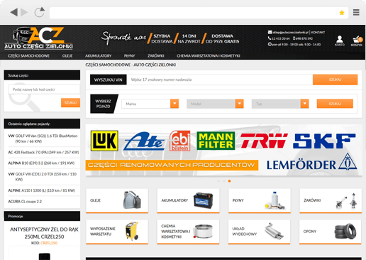 W intuicyjny sposób pozwala na samodzielny dobór i zamawianie podzespołów pasujących do posiadanego pojazdu. Nasza platforma e-commerce daje możliwość sprawdzania stanów i cen dostawców online, wyświetlania ich oraz składania zamówień bezpośrednio w hurtowniach, bez konieczności ponoszenia kosztów magazynowania towarów. Oferujemy coraz bardziej popularną formę współpracy z dostawcami w modelu dropshiping. Stanowi to doskonały sposób na wzbogacenie oferty sprzedażowej oraz redukcję kosztów. Sklep internetowy wraz z pakietem oprogramowania Firma 2000 tworzą kompletny system, który dzięki możliwości automatyzacji wielu procesów, od złożenia zamówienia przez klienta do wysłania gotowej „paczki” - przyczynia się do realnej oszczędności czasu oraz redukcji kosztów.