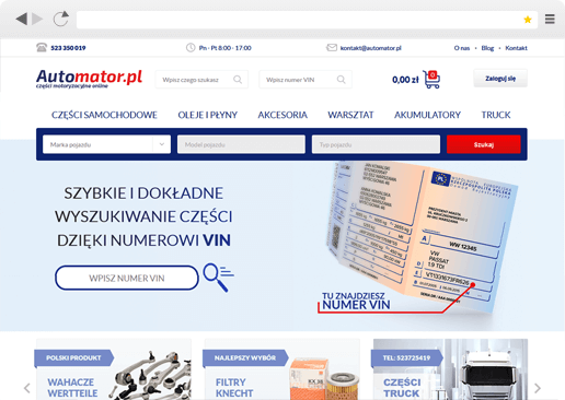 E-Sklep z wbudowaną funkcją wyszukiwania po numerach VIN to aktualny standard w doborze części samochodowych, opierający się na wygodzie i precyzji. Korzystając z wyszukiwania podzespołów po numerze vin samochodu, bezproblemowo odnajdziesz pozycje idealnie dopasowane do konkretnego pojazdu. System prezentuje tylko te części, które są zgodne z wcześniej podanym numerem VIN przez użytkownika, zapewniając dokładność i pewność w doborze komponentów do danego pojazdu.
