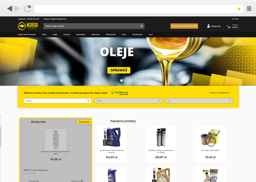 - wyszukiwarkę części wg pojazdu (marki, modelu i rodzaju silnika), drzewka, nazwy, kodu producenta lub OE,